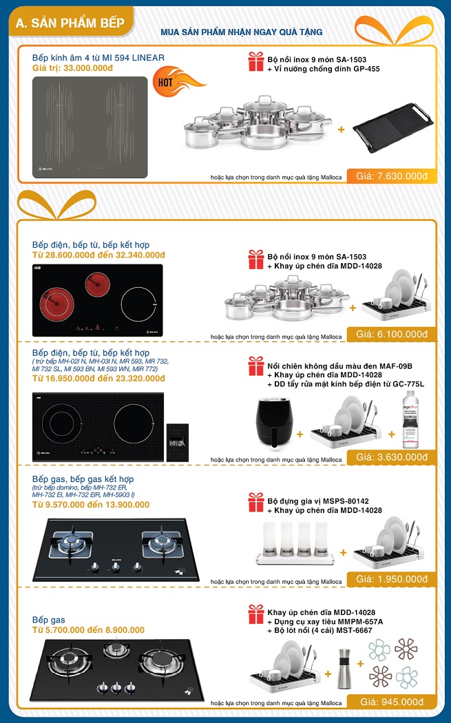 Các sản phẩm bếp điện, bếp từ, bếp kết hợp giá từ 28.600.000đ đến 32.340.000đ khi mua hàng sẽ được tặng kèm bộ nồi inox 9 món SA-1530 và khay úp chén đĩa MDD-14028 hoặc lựa chọn trong danh mục quà tặng Malloca với tổng trị giá phần quà là 6.100.000đ.