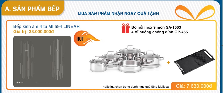 [HOT nhất] Bếp kính âm 4 từ MI 594 LINEAR trị giá 33.000.000đ khi mua được tặng bộ nồi inox 9 món SA-1503 và vỉ nướng chống dính GP- 455 hoặc có thể tùy ý lựa chọn trong danh mục quà tặng của Malloca các sản phẩm có trị giá 7.630.000đ.