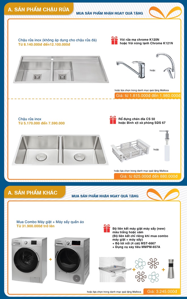 Chậu rửa inox Malloca giá từ 8.140.000đ đến 12.100.000đ được nhận phần quà gồm vòi rửa mạ chrome K120N hoặc vòi nóng lạnh Chrome K121N hoặc lựa chọn trong danh mục quà tặng Malloca với tổng trị giá từ 1.815.000đ đến 1.980.000đ.