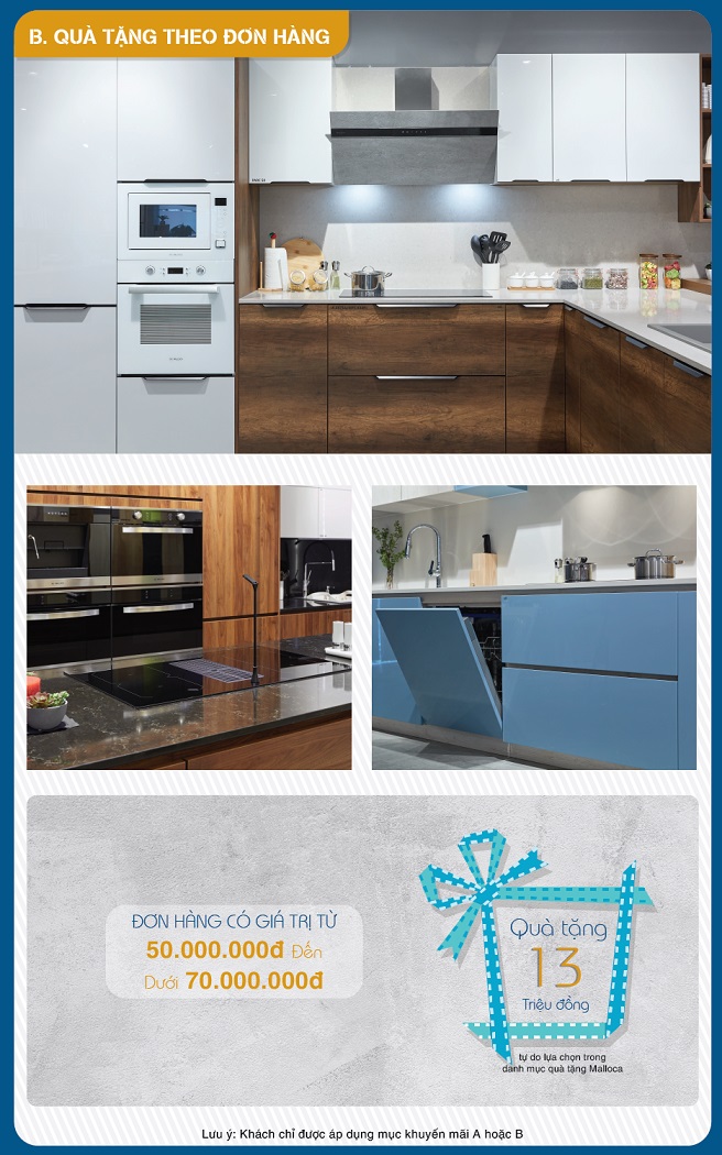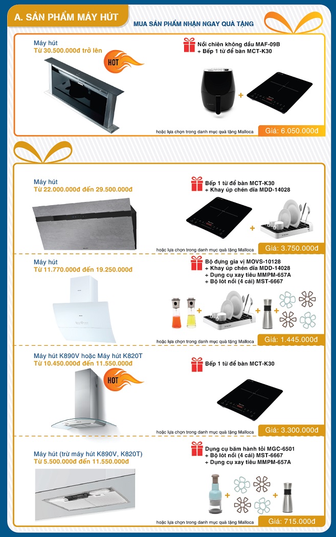Các sản phẩm máy hút từ 22.000.000đ đến 29.500.000đ được tặng bếp 1 từ để bàn MCT-K30 và khay úp chén đĩa MDD-14028 hoặc lựa chọn trong danh mục quà tặng Malloca với tổng trị giá phần quà là 3.750.000đ.