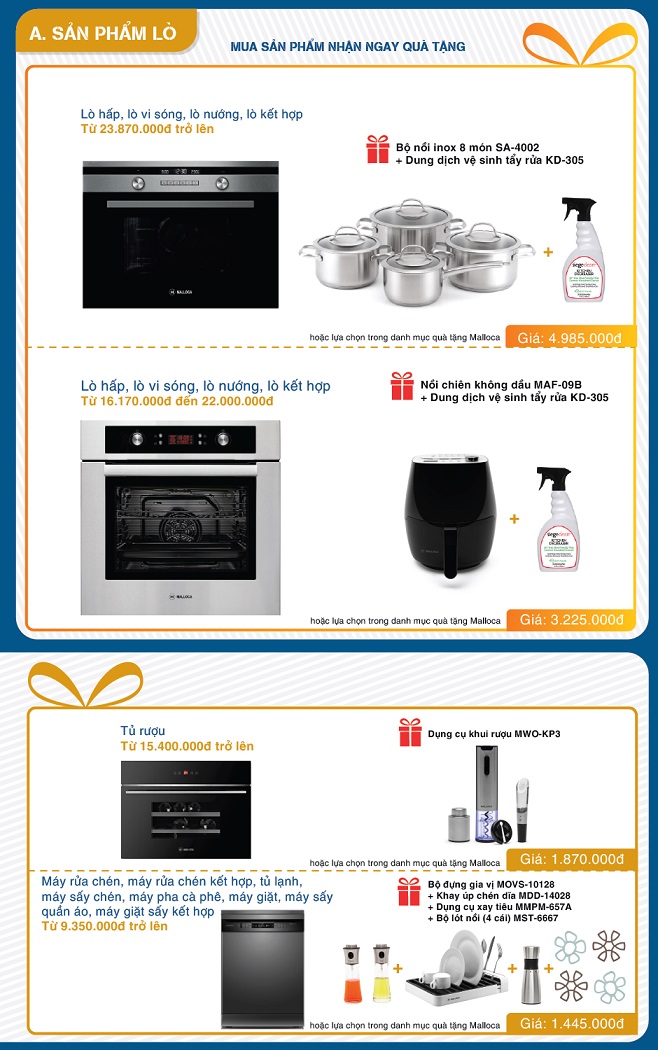 Mua lò hấp, lò vi sóng, lò nướng Malloca, lò kết hợp của Malloca giá từ 23.870.000đ trở lên được tặng bộ nồi inox 8 món SA-4002 + dung dịch vệ sinh tẩy rửa KD-305 hoặc phần quà trị giá 4.985.000đ.