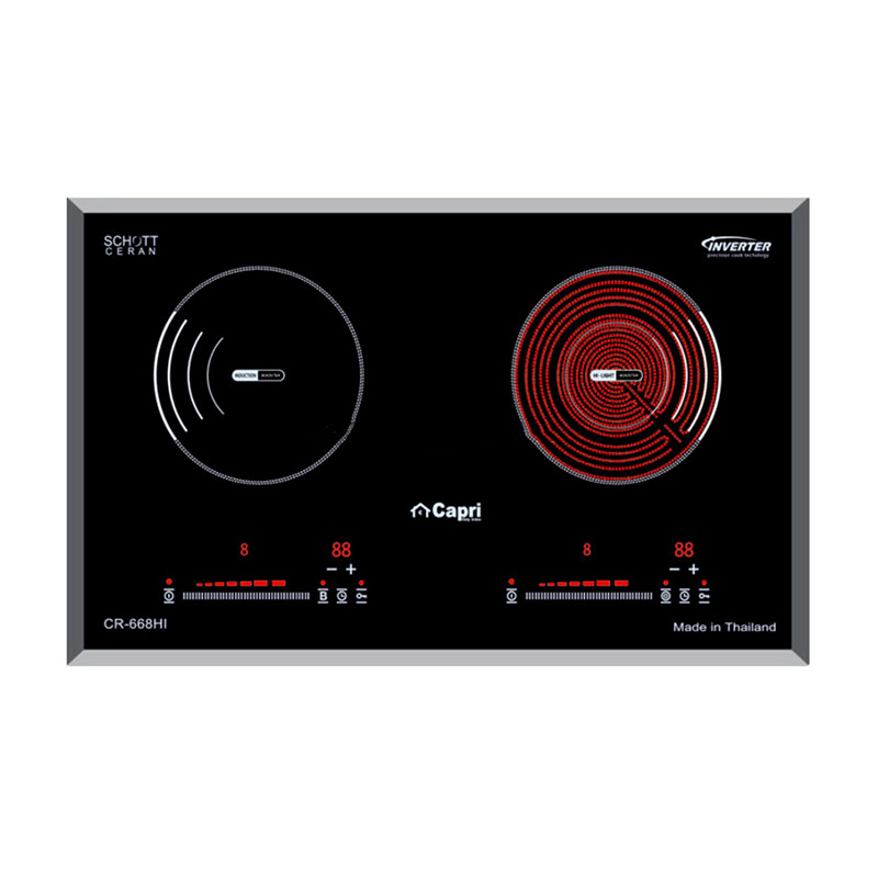 Bếp điện đôi 1 từ 1 hồng ngoại Capri CR 668HI thuộc dòng bếp điện thế hệ mới của Capri, được sản xuất trên dây chuyền công nghệ hiện đại theo tiêu chuẩn của châu Âu.