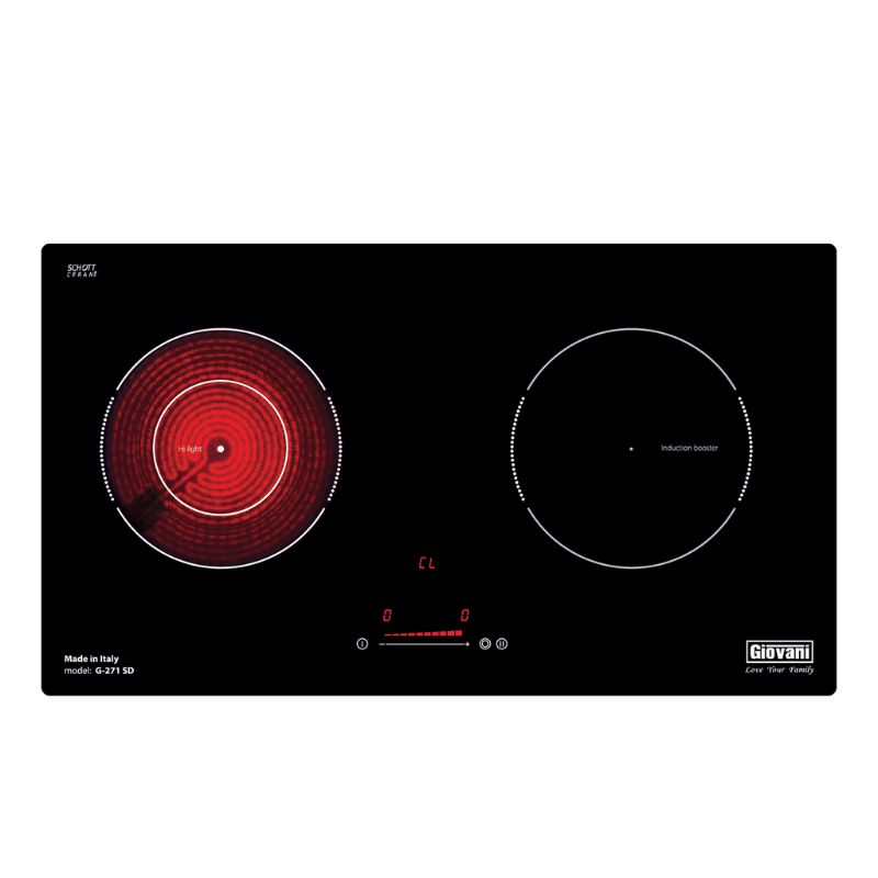 Bếp G-271SD là dòng bếp hỗn hợp cao cấp gồm 1 vùng từ và 1 vùng điện, mang đến sự linh hoạt tối ưu trong nấu nướng. Sản phẩm được trang bị linh kiện châu Âu chất lượng cao như mặt kính SCHOTT Ceran Germany, bo mạch IGBT Siemens và mâm nhiệt E.G.O – Hilight, đảm bảo độ bền vượt trội và hiệu suất hoạt động ổn định.