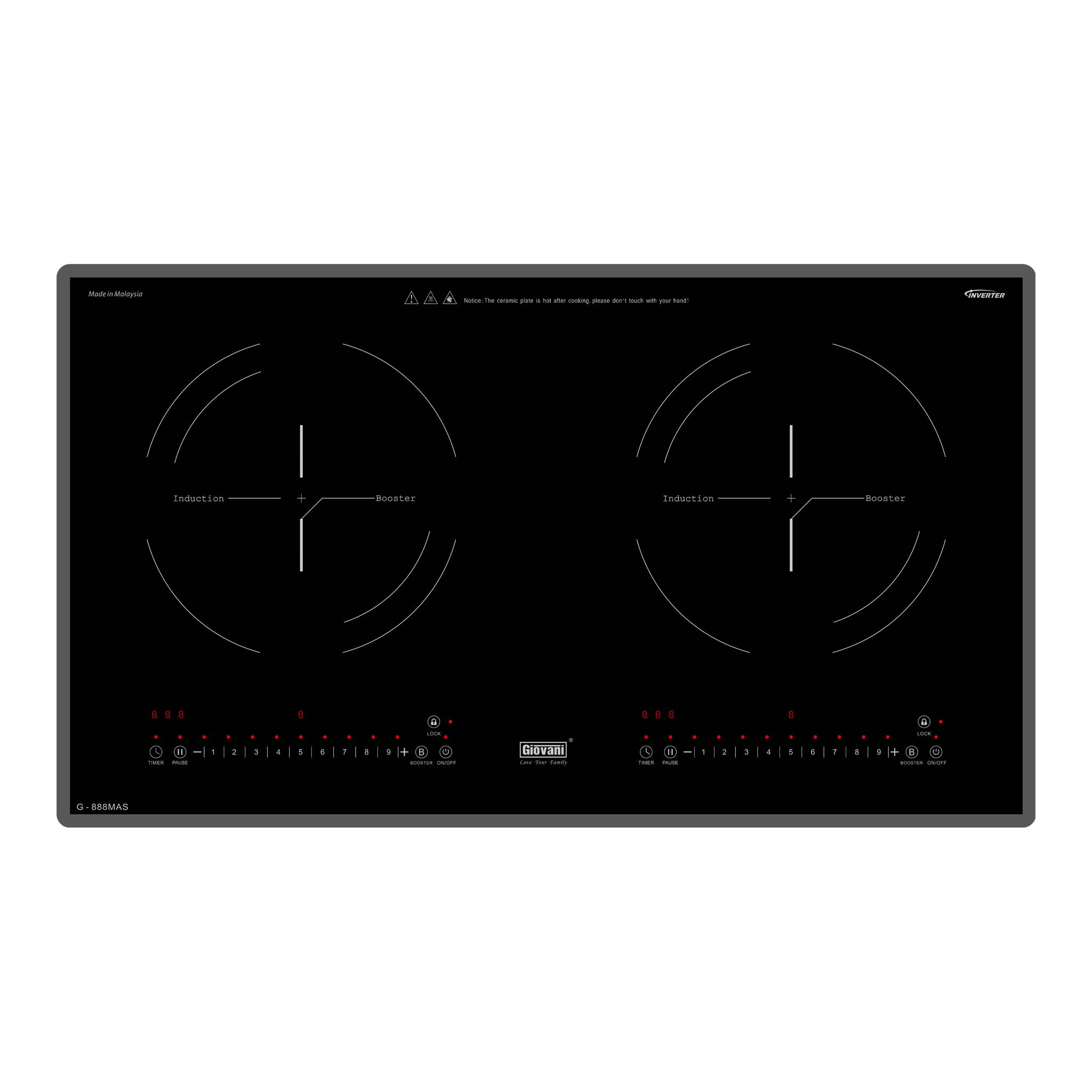 Bếp từ đôi Giovani G-888 MAS sở hữu thiết kế hiện đại với mặt kính Ceramic vát 4 cạnh kết hợp viền hợp kim nhôm cao cấp, mang lại vẻ sang trọng cho không gian bếp. Sản phẩm sử dụng linh kiện Siemens cùng công nghệ Inverter giúp tiết kiệm điện năng và đảm bảo hiệu suất nấu ổn định.