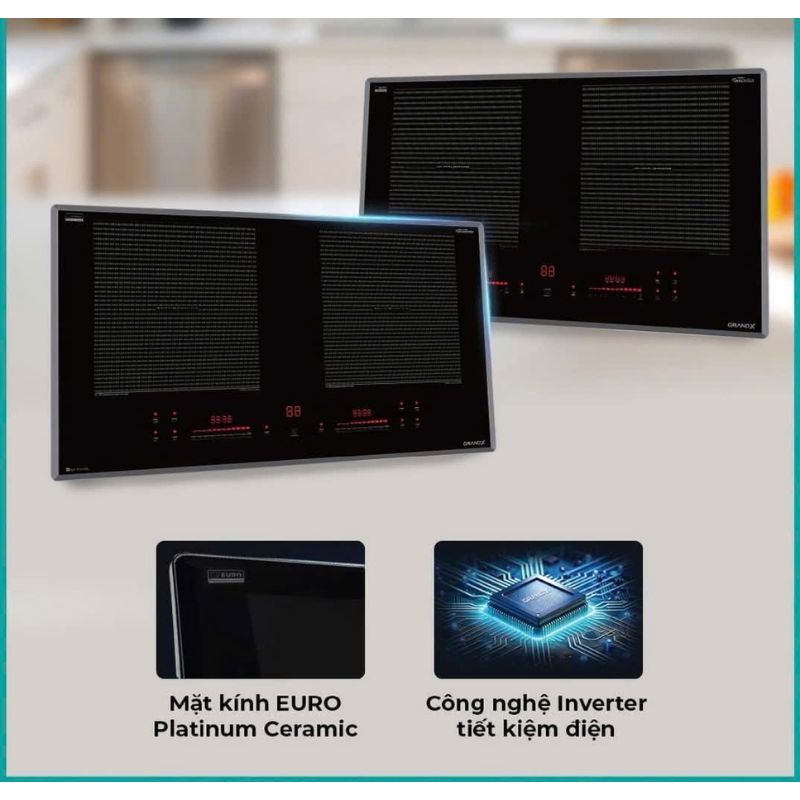 - Công suất mạnh mẽ, gia nhiệt nhanh: 2 vùng nấu, mỗi vùng 2.000W, Booster lên 2.300W, giúp nấu ăn nhanh hơn bếp gas truyền thống.