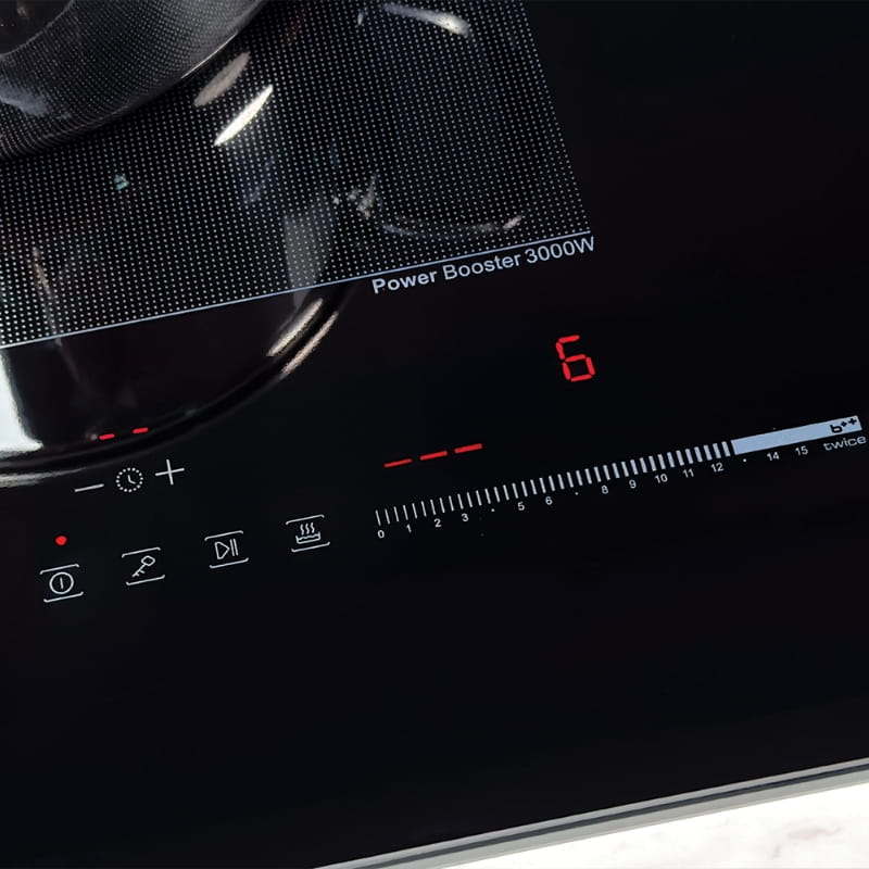 Bếp được trang bị bảng điều khiển cảm ứng trượt (Slider Control) hiện đại, cho phép điều chỉnh 15 mức công suất riêng biệt cho từng vùng nấu, cảm ứng có độ nhạy cao, phản hồi tức thì ngay cả khi tay ướt.