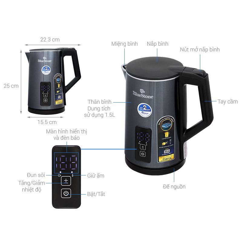 - Bình đun siêu tốc BlueStone cho phép điều chỉnh 6 mức nhiệt khác nhau, đáp ứng linh hoạt nhiều nhu cầu sử dụng nước ấm – nóng hằng ngày: