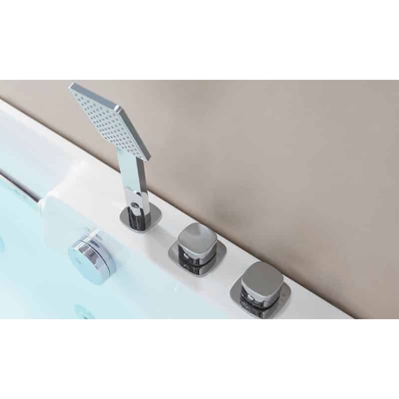 - Ở một bên viền thành bồn tắm, là hệ thống sen tay được mạ một lớp inox sáng bóng, phía dưới là nút điều chỉnh nước trong bồn. Người sử dụng có thể thao tác dễ dàng hơn trong quá trình tắm, bạn không cần phải mất quá nhiều thời gian khi chỉ cần một vài hành động nhẹ nhàng.