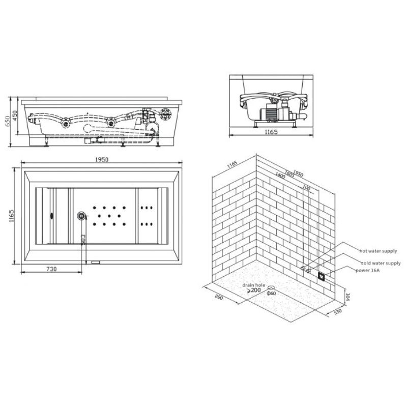 - Kích thước của bồn tắm massage NG-1910D Âm là 1950*1165*650 mm.