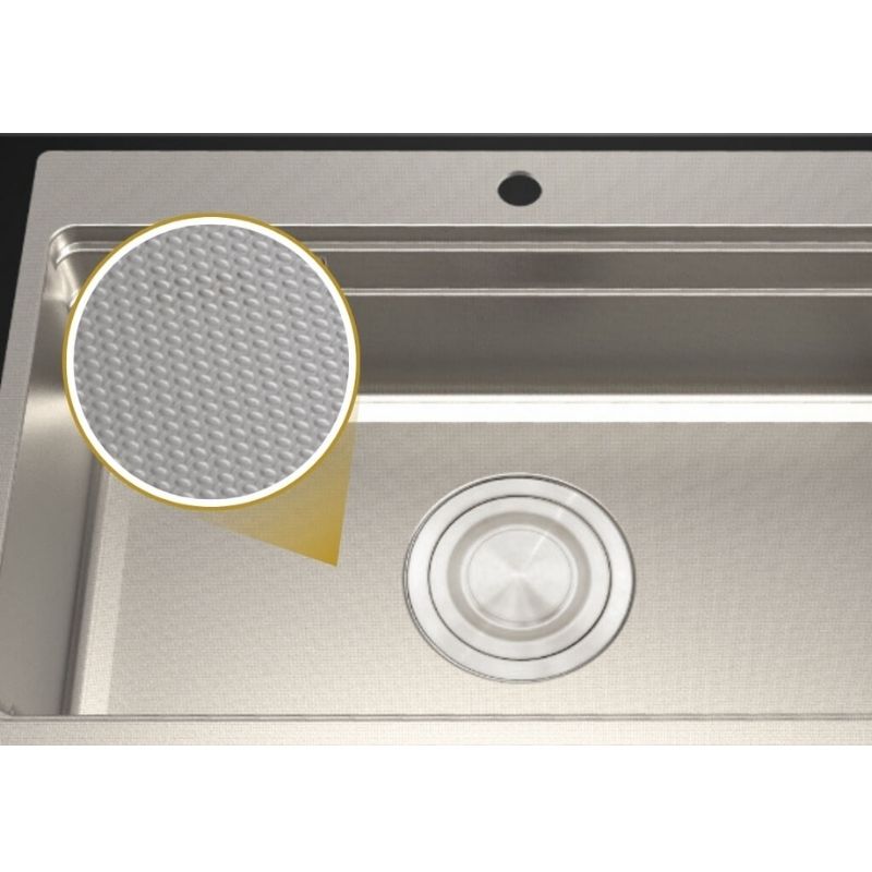 Thiết kế 1 hộc rộng rãi, tối ưu không gian: Chậu được thiết kế một hộc lớn không có bàn chờ, giúp tập trung toàn bộ không gian cho việc rửa và sơ chế thực phẩm, tạo sự gọn gàng và hiện đại cho mặt bếp.