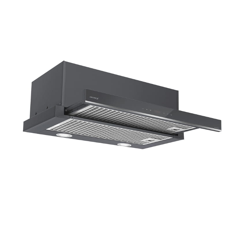 Máy hút mùi Grand X GX H70F58G được thiết kế dạng âm tủ kéo rút (Telescopic), giúp che giấu toàn bộ thân máy trong tủ bếp, mang lại tổng thể gọn gàng, hiện đại. Phần kính trước vát cạnh Beveled Edge tăng tính thẩm mỹ và cảm giác cao cấp cho không gian bếp. Thân máy sơn tĩnh điện xám chống bám bẩn, chống dầu mỡ, giữ màu sắc bền đẹp theo thời gian.