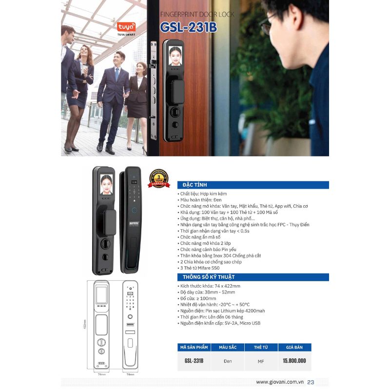 - Chức năng mở khóa: Vân tay, Mật khẩu, Thẻ từ, App wifi, Chìa khóa cơ