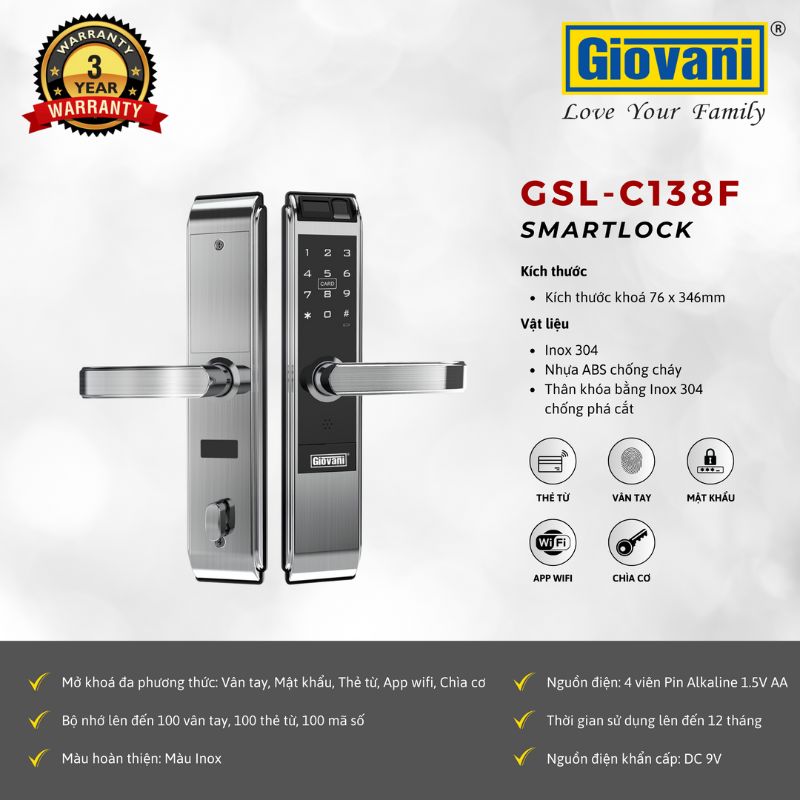 - Chức năng mở khóa: Vân tay, Mật khẩu, Thẻ từ, Chìa khóa cơ