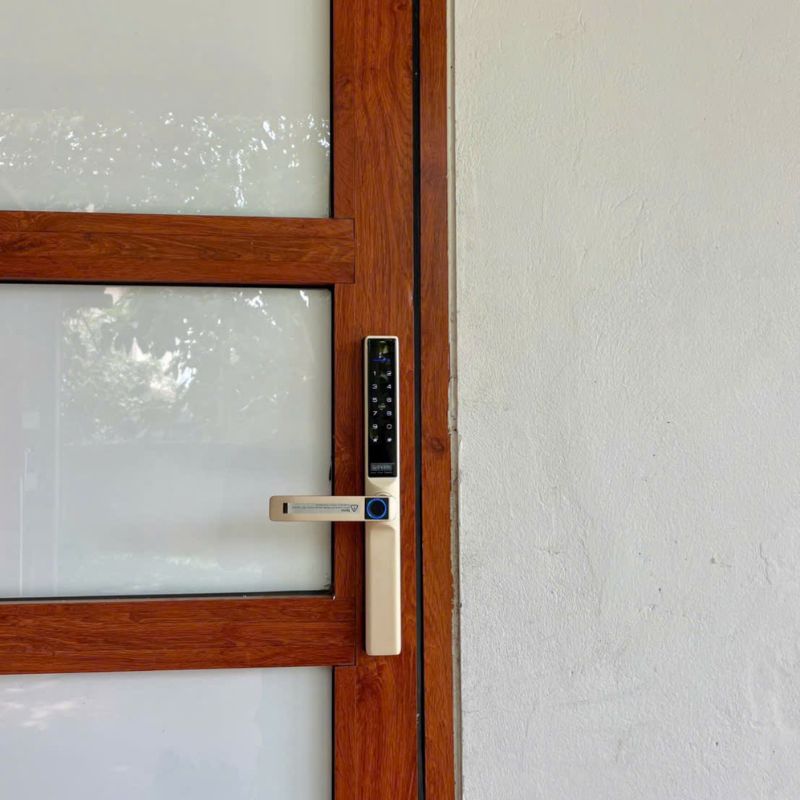 Khóa cửa thông minh vân tay hợp kim nhôm màu vàng (Wifi – chống nước IP56) mang phong cách sang trọng, phù hợp cho biệt thự, nhà phố cao cấp. Thiết kế mỏng kết hợp kết nối Wifi giúp quản lý từ xa tiện lợi và tăng tính thẩm mỹ cho cửa nhôm, cửa sắt.