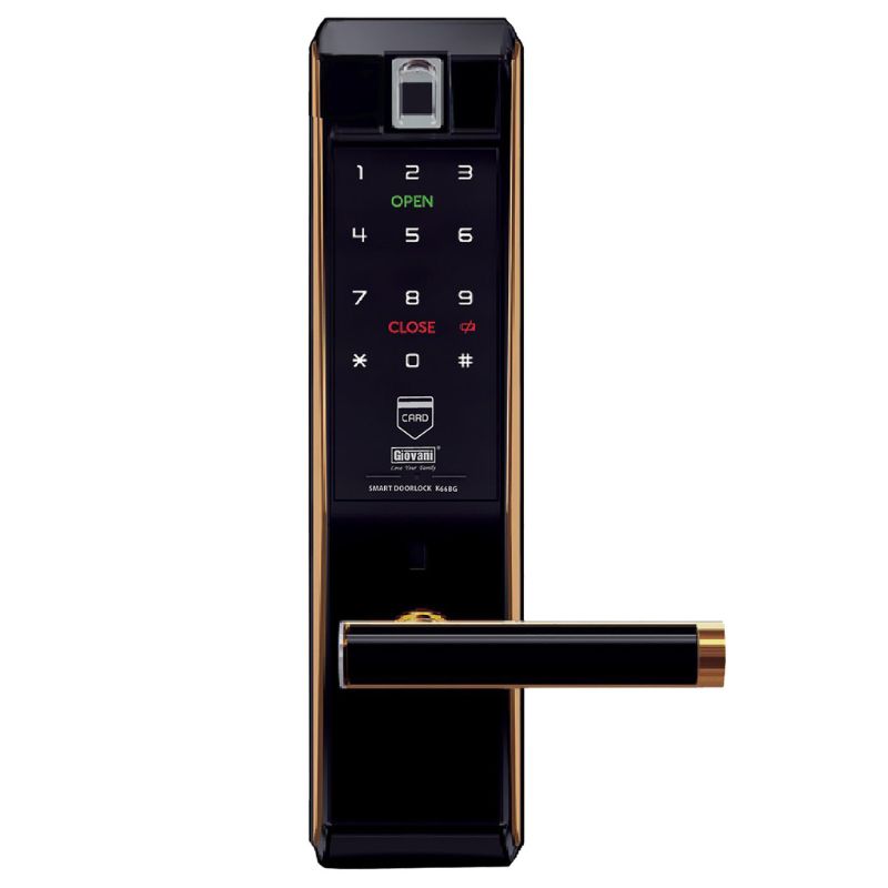 Khóa cửa thông minh vân tay hợp kim & nhựa ABS màu đen vàng nổi bật với thiết kế sang trọng, cá tính, phù hợp cho nhiều không gian như căn hộ, nhà phố và biệt thự. Sản phẩm tích hợp đa dạng phương thức mở khóa cùng loạt tính năng an ninh hiện đại, mang lại sự tiện lợi và bảo vệ toàn diện cho ngôi nhà.