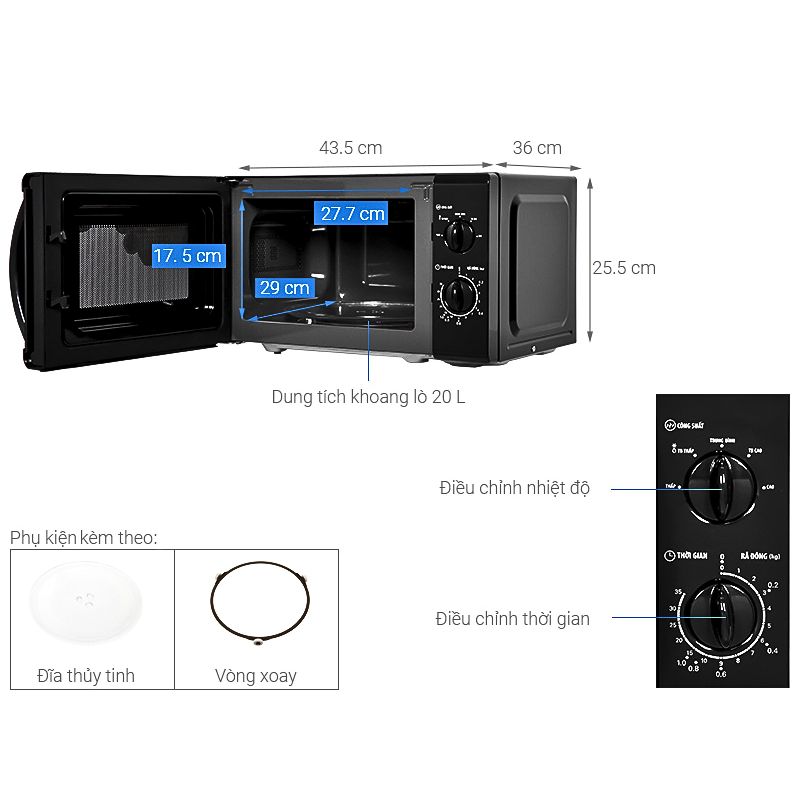 - Bảng điều khiển cơ đơn giản, dễ dùng: Trang bị 2 núm xoay cơ học: 1 núm chỉnh công suất (5 mức) và 1 núm hẹn giờ (lên đến 35 phút). Thiết kế có chỉ dẫn tiếng Việt rõ ràng, phù hợp với cả người lớn tuổi, thao tác nhanh chóng và chính xác.