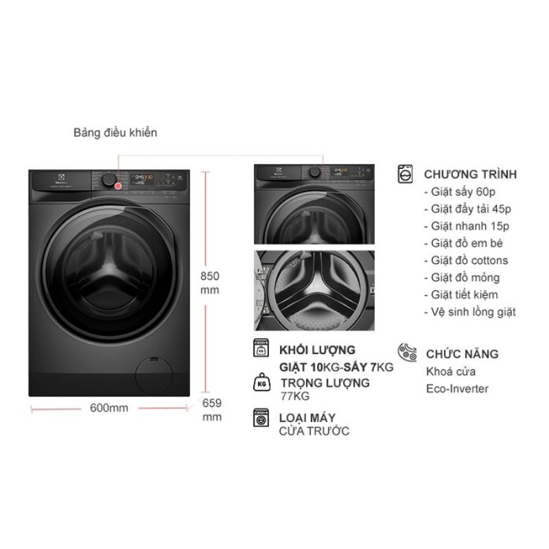 - Khối lượng giặt 10kg – sấy 7kg: Phù hợp cho gia đình từ 4–6 người.