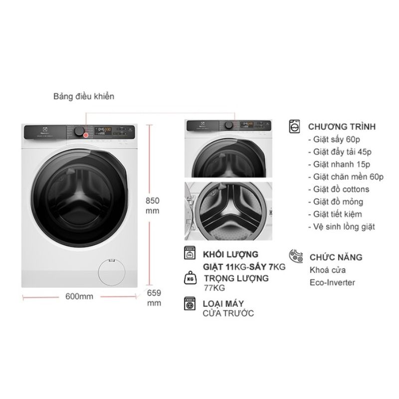 - Khối lượng giặt 11kg – sấy 7kg: Phù hợp cho gia đình từ 4–6 người.