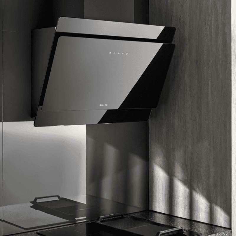 Thiết kế áp tường kính nghiêng hiện đại: Tông màu đen sang trọng, mặt kính có thể mở nhẹ giúp hút khói và mùi tập trung, tăng hiệu quả khử mùi.