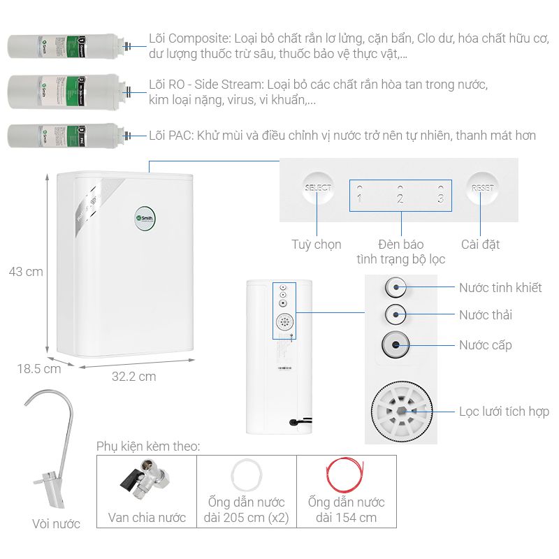 - Hệ thống 3 lõi lọc hiệu quả: Lõi Composite: Loại bỏ cặn bẩn, Clo dư, hóa chất hữu cơ, thuốc trừ sâu,… Lõi RO – Side Stream: Loại bỏ chất rắn hòa tan, kim loại nặng, vi khuẩn, virus,… Lõi PAC: Khử mùi, cân bằng vị nước tự nhiên, dễ uống.