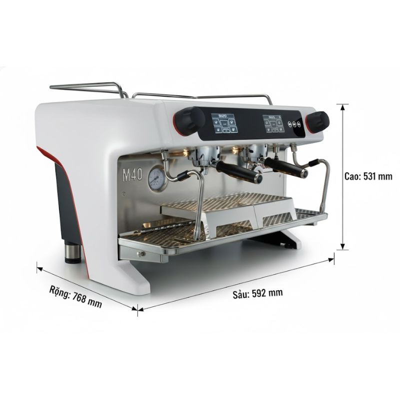 - Kết cấu gọn nhẹ – tối ưu không gian quầy pha chế: M40 sở hữu thiết kế nhỏ gọn hơn về chiều rộng và chiều cao so với các thế hệ trước, góp phần tối ưu diện tích quầy bar và tăng sự tương tác giữa barista với khách hàng. Trọng lượng máy cũng được giảm khoảng 30%, giúp việc lắp đặt, di chuyển và bảo trì trở nên dễ dàng hơn.