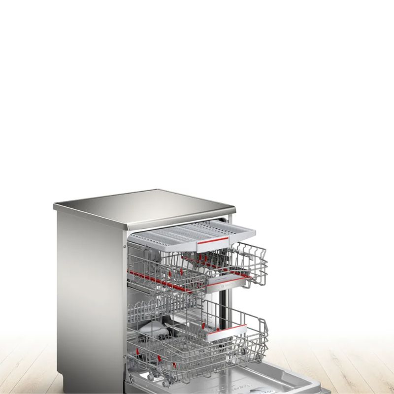 - Giá đỡ linh hoạt tối đa: Máy rửa bát Bosch SMS6ZCI01P Series 6 được trang bị giá đỡ linh hoạt tối đa, mang lại sự tiện lợi vượt trội trong việc sắp xếp bát đĩa, dao kéo và các vật dụng lớn. Với giá đỡ thứ 3 tiêu chuẩn, máy tạo ra không gian lý tưởng để chứa các dụng cụ như dao kéo, muỗng, nĩa và các vật dụng có kích thước lớn khác. Tính năng này giúp tối ưu hóa dung tích chứa, mở rộng thêm tới 30% không gian so với các máy rửa bát Bosch chỉ có hai giá đỡ, giúp người có thể rửa được nhiều đồ hơn trong một lần.