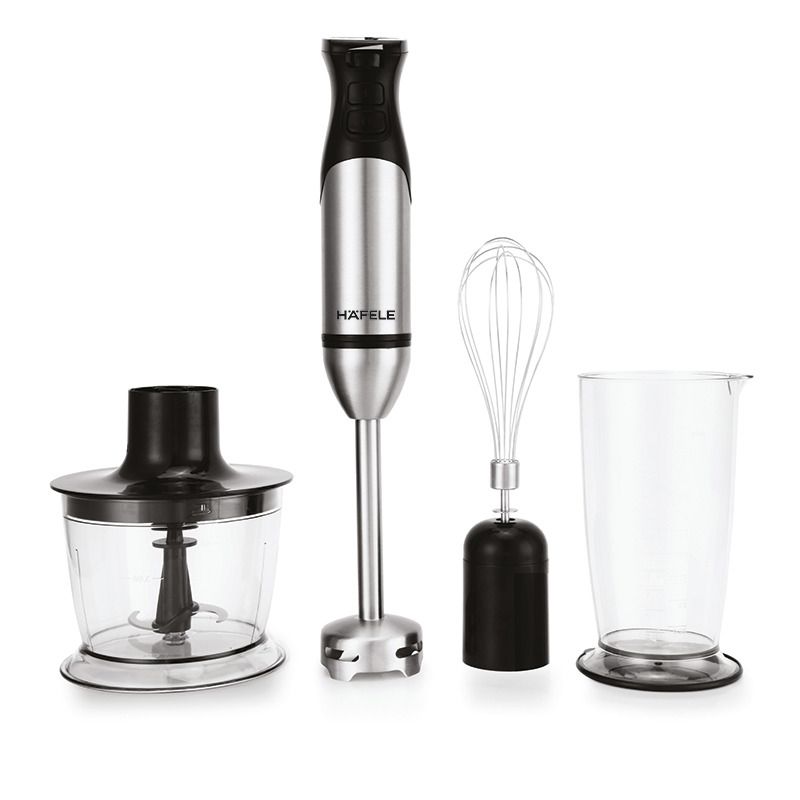 Máy xay cầm tay Hafele 535.44.166 sở hữu công suất mạnh mẽ 800W, đi kèm bộ phụ kiện đa năng gồm cối xay thịt, cốc đong và que đánh trứng, giúp xử lý nhanh gọn nhiều loại nguyên liệu, mang đến sự tiện lợi tối ưu cho gian bếp hiện đại.