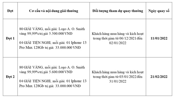 4. Đối tượng áp dụng: Tất cả khách hàng đã mua sản phẩm của A.O.Smith, đã hoàn thành việc lắp đặt và kích hoạt bảo hành thành công trong thời gian diễn ra chương trình.