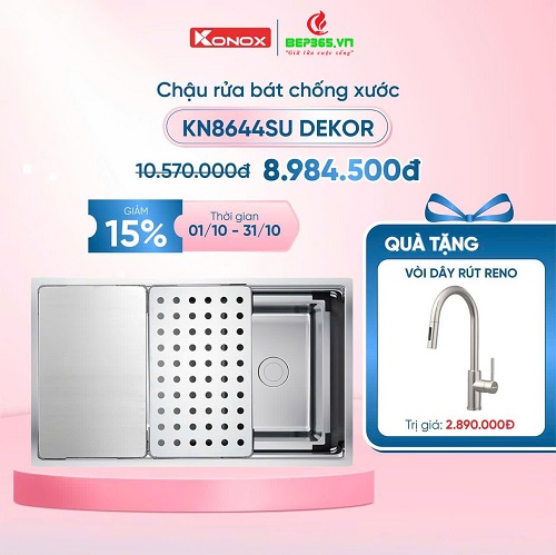 - Giảm 15% cho chậu chống xước tích hợp 4 phụ kiện KN8644SU và KN7644SU Dekor Series siêu hot. Tặng kèm vòi dây rút Reno trị giá 2.890.000đ.