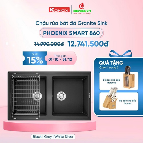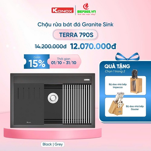 - Giảm 15% các mẫu Terra 790S, Terra 860S, Phoenix Smart 860, Livello Smart 1160 trong BST Chậu đá Granite sang trọng. Tặng kèm Bộ dao 5 món Konox Impecca hoặc Bộ dao 7 món Konox Gouter.