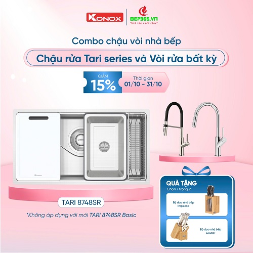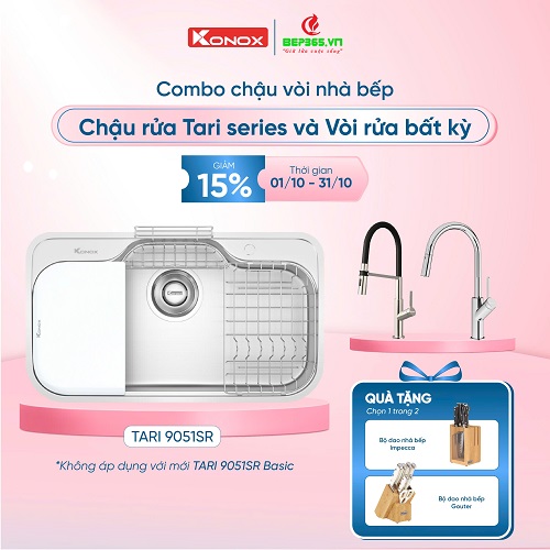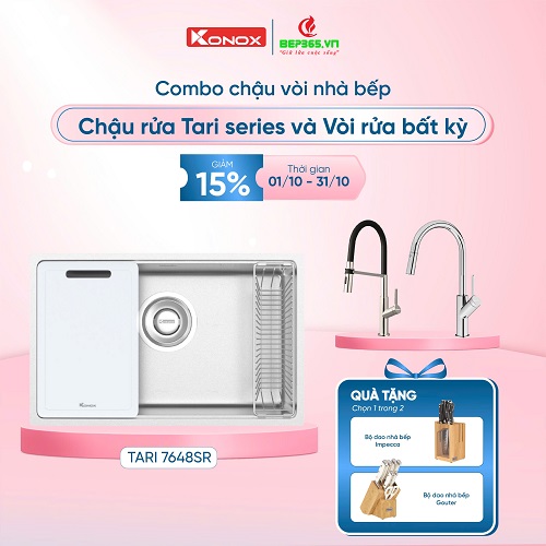 - Giảm 15% Chậu chống xước phong cách Nhật – Tari Series với các mẫu chậu: Tari 9051SR, Tari 7851SR, Tari 8748SR và Tari 7648SR. Tặng kèm Bộ 3 dao Impecca Classic trị giá 1.970.000đ khi mua phiên bản chậu full phụ kiện. Tặng kèm Bộ dao Konox Impecca hoặc Konox Gouter khi mua combo chậu vòi.