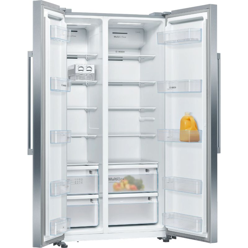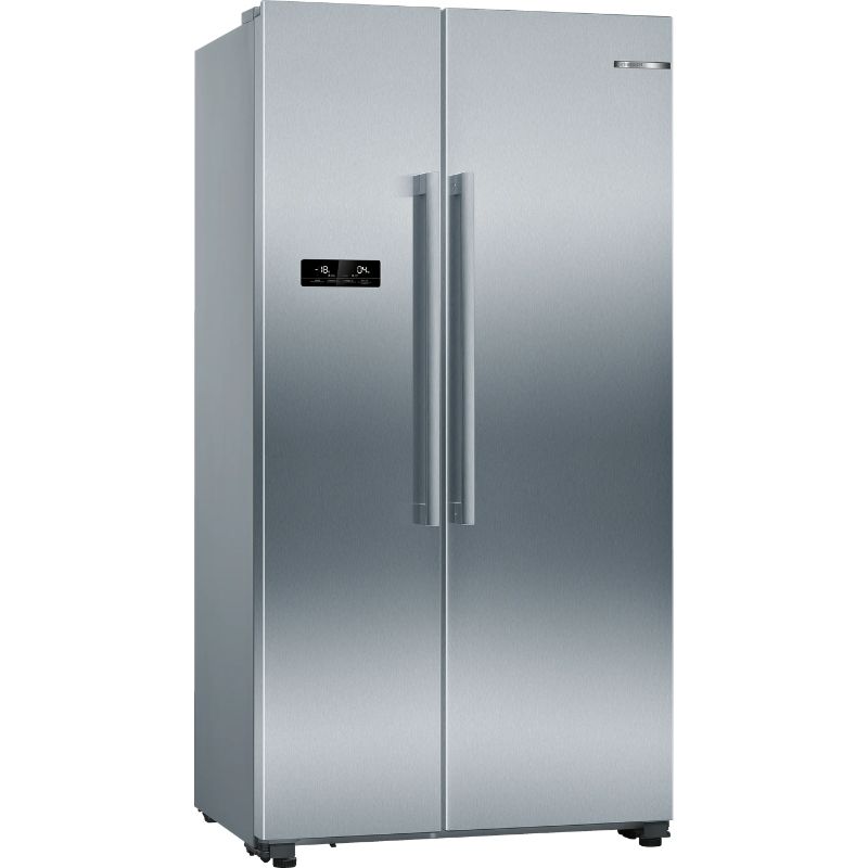 Tủ lạnh Bosch KAN93VIFP Serie 4 là mẫu tủ lạnh Side by Side cao cấp nổi bật với thiết kế thép không gỉ chống bám vân tay sang trọng cùng dung tích lớn lên đến khoảng 560L, đáp ứng hoàn hảo nhu cầu lưu trữ thực phẩm cho gia đình đông người. Sản phẩm được trang bị công nghệ NoFrost hiện đại giúp ngăn đóng tuyết, kết hợp hệ thống làm lạnh đa chiều và tính năng SuperCooling, SuperFreezing giúp bảo quản thực phẩm tươi ngon lâu hơn, đồng thời vận hành êm ái với độ ồn chỉ khoảng 42 dB.