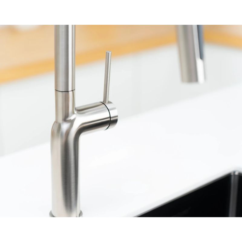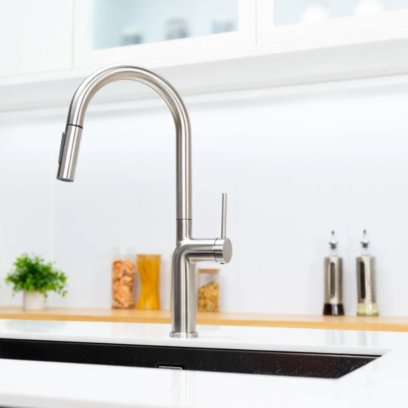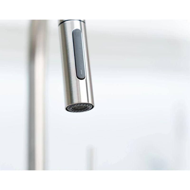 Vòi rửa bát dây rút NOBINOX ADORA NX992 gây ấn tượng mạnh với thiết kế tinh tế, phần thân vòi được gia công liền khối từ inox 304 cao cấp, mang đến độ chắc chắn và độ bền vượt trội. Các đường nét uốn cong mềm mại kết hợp cùng gam màu Niken hiện đại tạo nên vẻ ngoài sang trọng, dễ dàng hài hòa với nhiều phong cách bếp khác nhau.