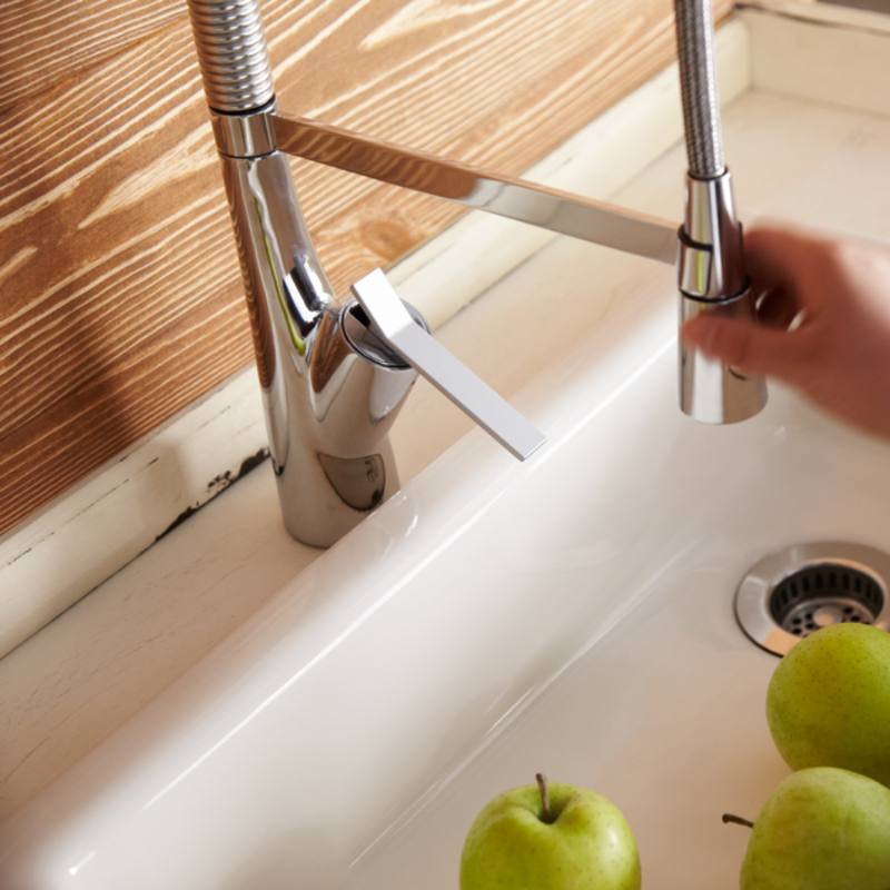 - Đầu vòi tháo rời linh hoạt: Đầu vòi có thể tách khỏi thanh cố định giúp dễ dàng kéo ra để vệ sinh bồn rửa, rửa rau củ hoặc làm sạch các vị trí khó tiếp cận một cách thuận tiện.