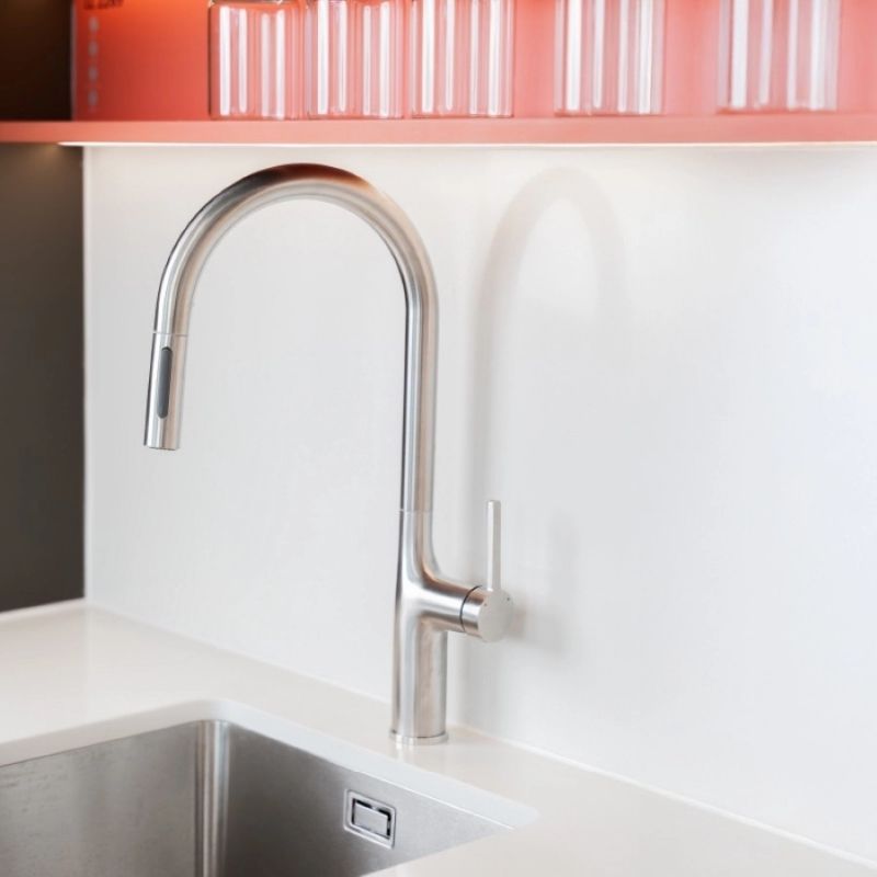 Thiết kế thân vòi bẻ gập tiện dụng: Thân vòi cao và linh hoạt, giúp thao tác trong bếp trở nên thuận tiện và thoải mái hơn.